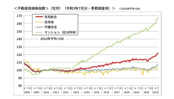 コロナ禍の影響もあり、不動産の販売戸数は、年々減少傾向にあります。 その一方で、1戸当たりの不動産価格(特に区分所有マンションの価格)は、グラフのように2012年以降、大きく上昇しています。 発売戸数が限られる中、マンションの需要は特に高く、右肩上がりに大きく価格が上昇していますね。